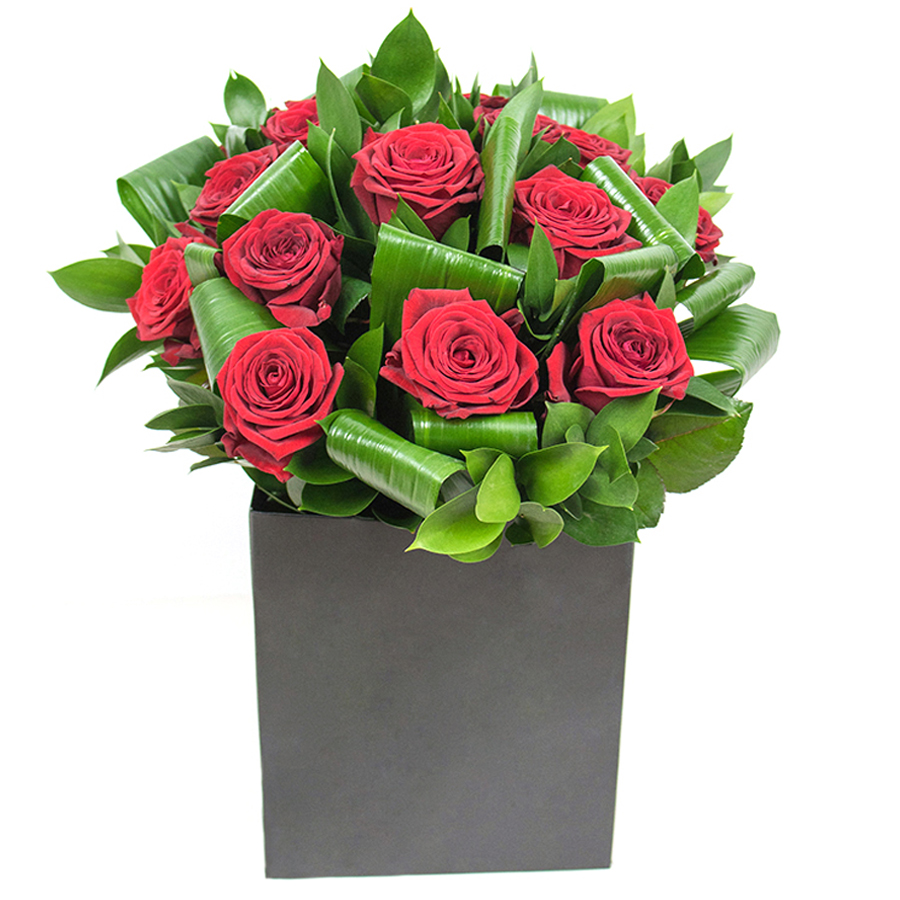 Add a touch of sophistication with our sophisticated red rose arrangement. This elegant bouquet features lush red roses paired with aspidistra leaves and ruscus, creating a unique and visually stunning display.